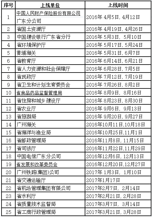 二是常規上線單位18個:中國人民財產保險股份有限公司廣東分公司、省國土資源廳、中國建設銀行廣東省分行、省環境保護廳、黃埔海關、省民政廳、省衛生和計劃生育委員會、省食品藥品監督管理局、省住房和城鄉建設廳、省農業廳、省旅游局、廣州海關、省海洋與漁業局、省郵政管理局、省司法廳、中國電信廣東分公司、省發展和改革委員會、省水利廳。
