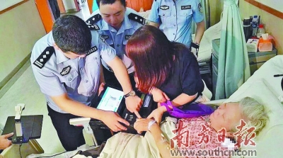 河源市公安局出入境管理支隊民警來到源城區人民醫院,利用“出入境移動服務一體機”為躺在病床上的一名危重病人提供了港澳通行證續簽辦證服務。