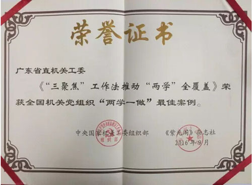 由中央國(guó)家機(jī)關(guān)工委組織部和《紫光閣》雜志社聯(lián)合組織的“兩學(xué)一做”案例征集評(píng)選結(jié)果日前揭曉。廣東省直機(jī)關(guān)工委總結(jié)省直機(jī)關(guān)理論武裝的工作經(jīng)驗(yàn),報(bào)送的《“三聚焦”工作法推動(dòng)“兩學(xué)”全覆蓋》案例,從中央國(guó)家機(jī)關(guān)各部門(mén)和全國(guó)各省區(qū)市機(jī)關(guān)黨組織共501個(gè)案例中脫穎而出,被評(píng)為全國(guó)機(jī)關(guān)黨組織“兩學(xué)一做”最佳案例。