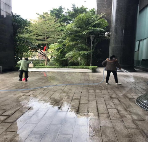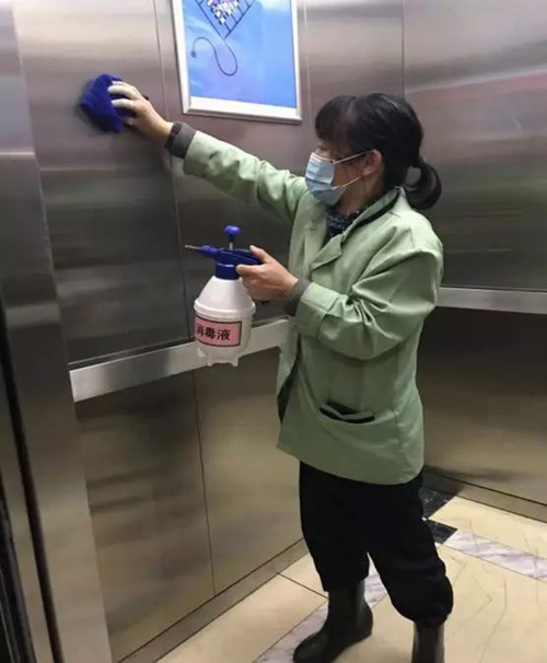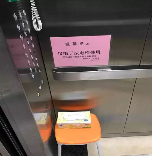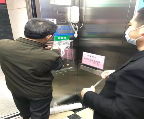 對電梯內外按鈕均粘貼保鮮膜,并配備了按鍵專用紙巾,最大限度消除傳染源。