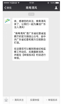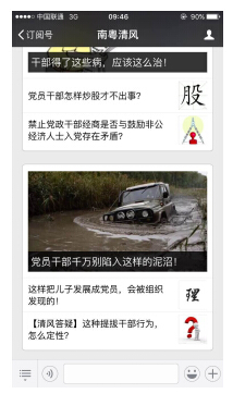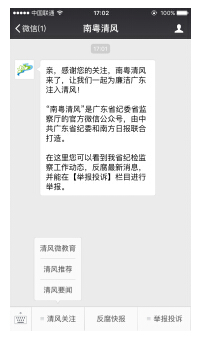 (二)要求黨員干部閱讀、收藏相關學習文章。關注“南粵清風”微信公眾號后,進入主界面,如下圖所示: