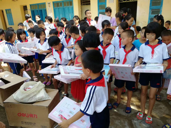 為深入學(xué)習(xí)貫徹黨的十九大精神,在廣大小學(xué)生中廣泛開展社會主義核心價(jià)值觀學(xué)習(xí)教育,合力推進(jìn)廳扶貧攻堅(jiān)任務(wù)落實(shí)。7月25日,廳關(guān)工委、直屬機(jī)關(guān)團(tuán)委赴廳扶貧點(diǎn)海角村小學(xué)開展“捐書助學(xué)獻(xiàn)愛心”活動,并在學(xué)校操場舉行了簡樸隆重的贈書儀式。30名學(xué)生代表統(tǒng)一穿由廳關(guān)工委贈送的校服、佩戴紅領(lǐng)巾,興高采烈接受廳關(guān)工委、團(tuán)委贈送社會主義核心價(jià)值觀、小學(xué)生課外讀本等各類書籍200多本(套)、文具禮盒100套。
