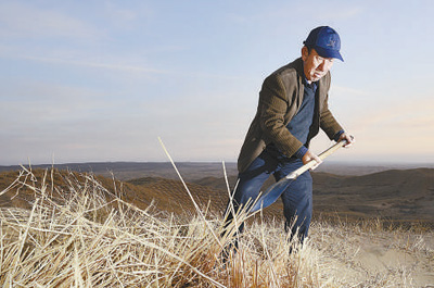 圖為王有德在毛烏素沙漠邊緣扎草方格。 新華社記者王鵬攝