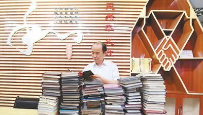 馬善祥在“老馬工作室”內整理工作筆記本。 新華社記者王全超攝