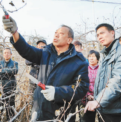 李保國(前左)在河北省內丘縣崗底村向村民講解果樹修剪知識。新華社記者朱旭東攝